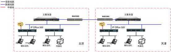 途家網(wǎng)辦公電話系統(tǒng),分為兩部分,第一部分建設(shè)地在北京,第二部分建設(shè)地在天津。兩地均采用IP Office 500 V2 Sever Edition(S8100)架構(gòu)進(jìn)行建設(shè)。兩地分別出局,采用H.323協(xié)議進(jìn)行組網(wǎng)。全部采用模擬分機(jī),總門(mén)數(shù)超過(guò)1500門(mén)。